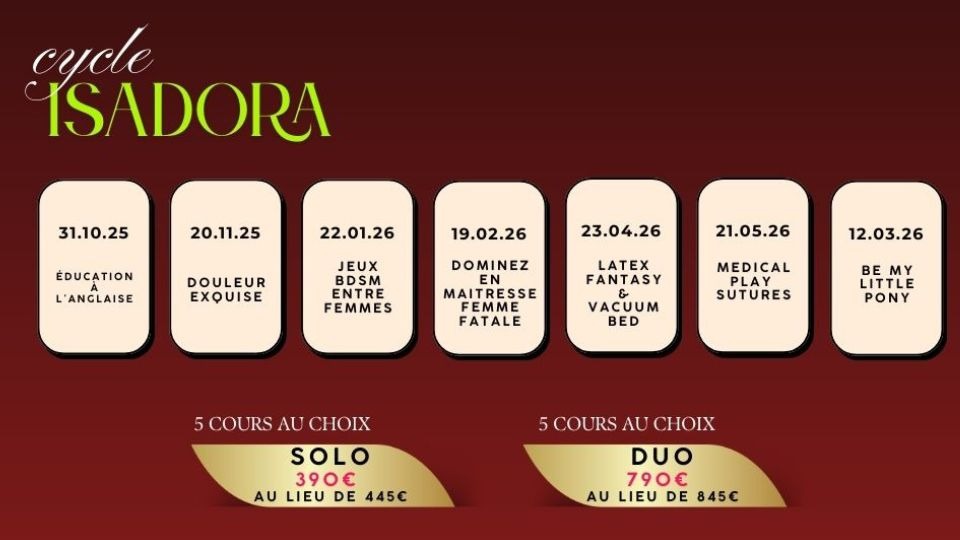 À la fois dominatrice professionnelle et lifestyle, Maîtresse Isadora s’impose comme l’une des figures emblématiques de la domination française contemporaine. Présente sur la scène internationale, elle incarne et défend un BDSM élégant, sophistiqué et sensuel, dont la véritable finalité réside dans la création d’une connexion authentique et profonde avec son partenaire.
